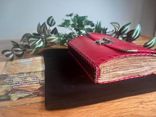 A5 size, ecoprinted handmade, handstitched writing/sketching journal/notebook. 128 pages. Recycled high quality paper is ecoprinted using local leaves in a boiling process, giving each page an antiqued manuscript look. Then handsewn using an old-style bookbinding technique, creating a unique journal, made right here in kerry. We use quality upcycled materials where possible, such as fabrics and belts to create your personal journal. Ecoprinting is the process of transferring the colour of leaves and flowers onto a piece of paper. It is a natural dyeing practice which is sustainable and ecofriendly for humans and for the environment.